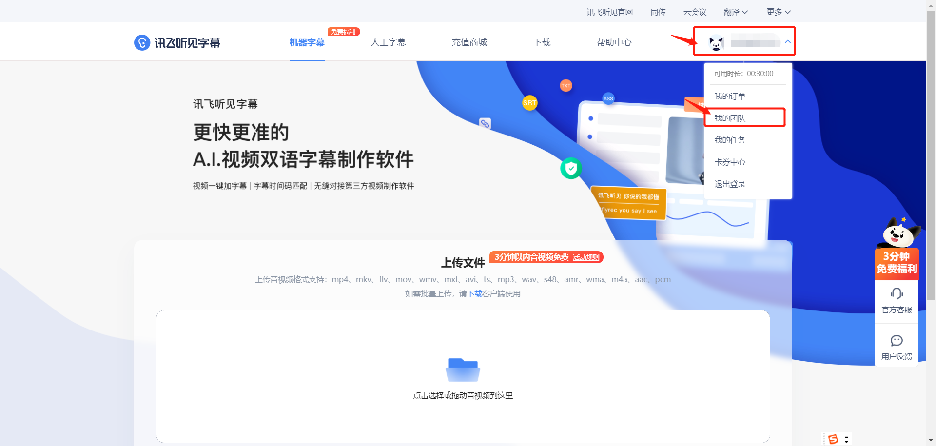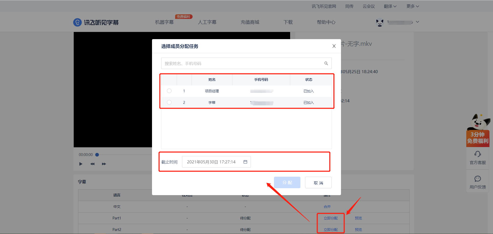 准备:准备至少2个以上讯飞听见字幕账号,其中一个是项目管理员账号、其他为团队成员账号。
