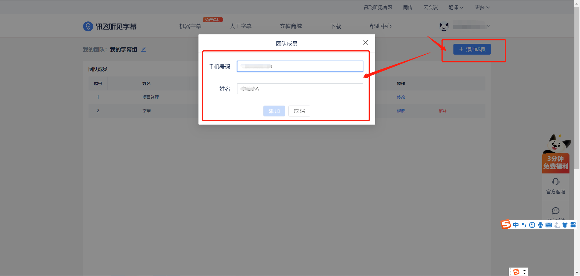 登录管理员账号,进入团队管理界面,点击添加成员,输入团队成员的讯飞听见字幕注册账号确认添加即可。