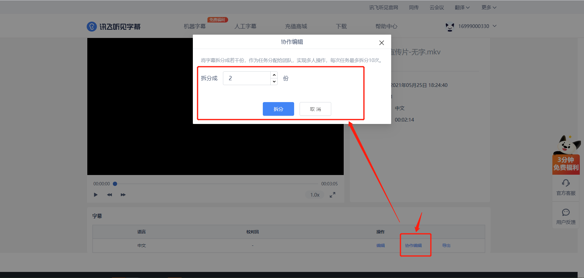 在音视频操作处,点击更多,进入任务拆分界面;点击操作区按钮—协作编辑,将任务拆分为N份。